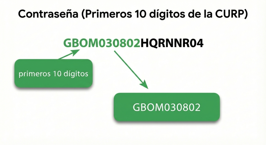 La contraseña se genera a partir de LOS PRIMEROS 10 DíGITOS de tu CURP (4 letras y 6 números en mayúsculas todo)