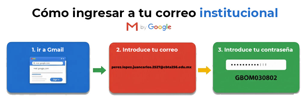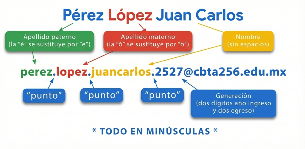 Tu cuenta de correo se genera a partir de tu apellido paterno “punto” apellido materno “punto” nombre “punto” año que ingresan a la institución y “@cbta256.edu.mx”, todo sin espacios y en minúscula. En el caso de los correos, la “ñ” se debe sustituir por “n”.